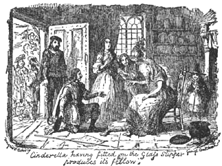 くつはまわりまわって、シンデレラのいえにもやってきました。姉たちはなんとかしてくつに足をおしこもうとしましたが、どうにもこうにもなりませんでした。シンデレラはよこで見ていて、ガラスのくつが、うばからもらったあのくつだということに気がつきました。そこで、わらいながらいいました。