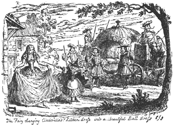そこで、うばはステッキでシンデレラの服をたたきました。するとどうでしょう、みるみるうちに、シンデレラの服は金や銀、ほうせきなどをちりばめた、りっぱなドレスにかわってしまいました。そして、うばは、いっそくの小さなガラスのくつをシンデレラにあたえました。せかいのどんなものよりかわいらしい、すてきなくつでした。