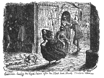 シンデレラがこうして、ふたりの姉をたのしませているうちに、十一じ四十五ふんのかねがなりました。シンデレラはあわてて、みんなにおわかれのあいさつをしてから、いちもくさんに、かいじょうをあとにしました。