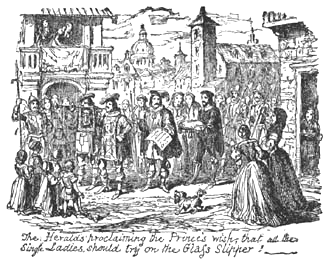 ふたりのいったことは、まったくそのとおりでした。なんにちかたった日のこと、トランペットがなって、王子さまのことで、おふれがあるといったのです。なんと、そのひろったガラスのくつが、ぴったり足に入る女のひとを、王子さまのはなよめにする、というではありませんか。